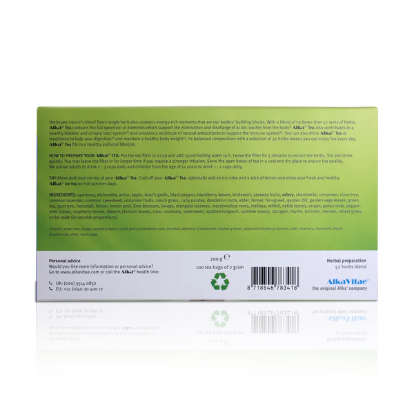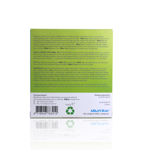 Harness the power of nature with Alka® Tea, a unique blend of 52 carefully selected herbs. Each herb contributes vital energizing elements that support the body’s natural processes, ensuring effective de-acidification and promoting overall wellbeing.